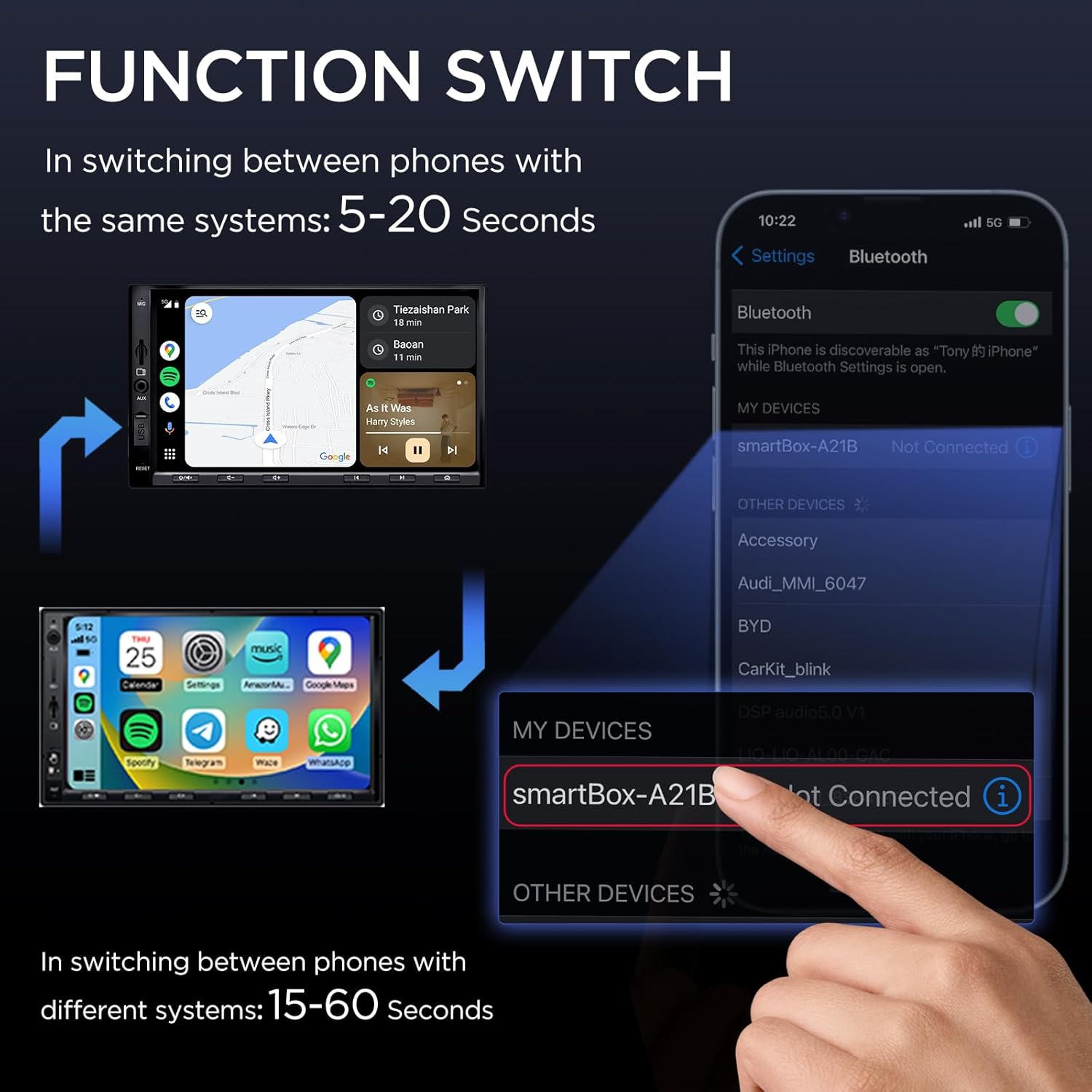 Equipped with 5.8 GHz WiFi and Bluetooth 5.3, the SMT-AC01 adapter reconnects in seconds, ensuring no delays in navigation, music, and calls. With speeds 3x faster than regular adapters, it provides a smooth, reliable experience, allowing you to focus on safe and enjoyable driving.